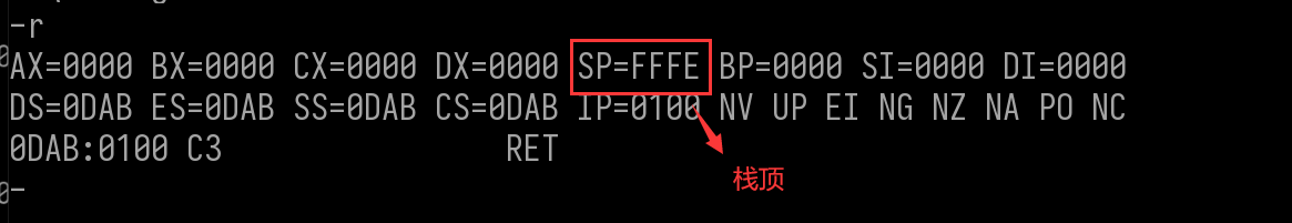 这里查看数据内存是 -d ss:fffo 是因为 sp寄存器的段基址 是 ss,sp是段偏移