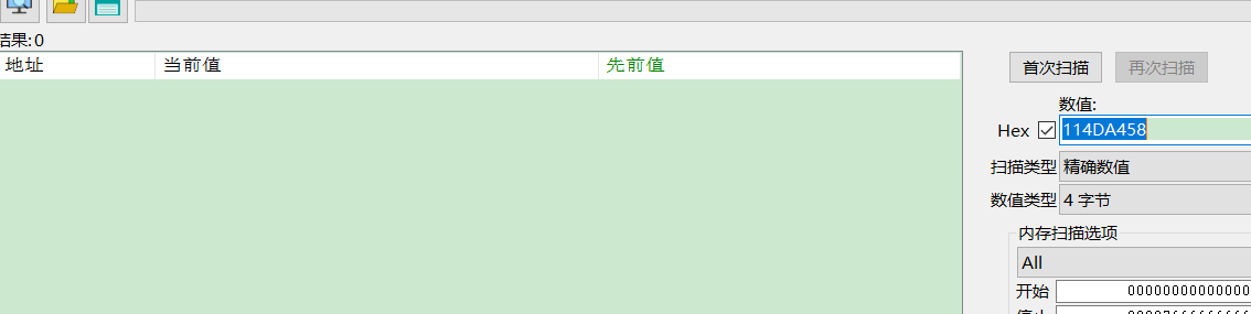 点击 首次扫描 然后出现了肯定是N多的结果,因为太多了,CE没有显示出来。