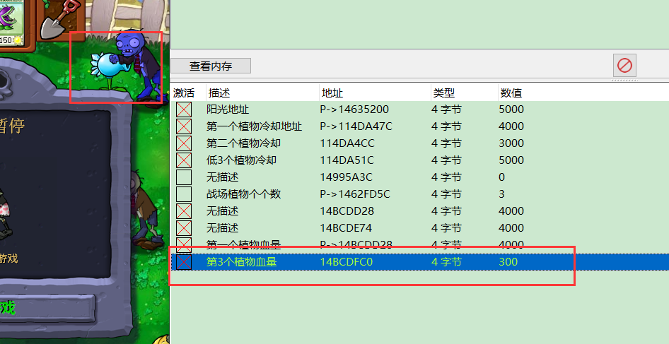 所以推测第3个植物血量 在 14BCDE74 + 0x14C = 14BC DFC0 位置